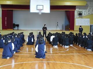 (下、朝の生徒集会の様子です、語先後礼、立礼、座礼等の説明がありました)