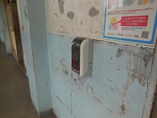(下、各教室前に設置された自動手指消毒器です。触らずにアルコールが出てきます)