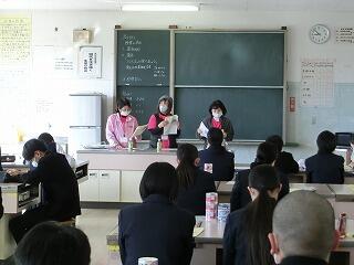 昨日に引き続き「延岡市食生活改善推進員連絡協議会」から3名の講師を招いて「もしもの時(非常時)に利用できる缶詰の加工」についてお話をお伺いしました。缶詰は、新鮮な食材を利用して作られる話や利用範囲が広いことなど、貴重なお話をお伺いしました。本校は、本年度「防災・減災」を題材として、総合的な学習の時間で探究活動に取り組んでいます。今回のお話を受けて、食料備蓄の必要性や缶詰の活用法についてよい学びができました。2日間に渡る講義ありがとうございました。