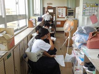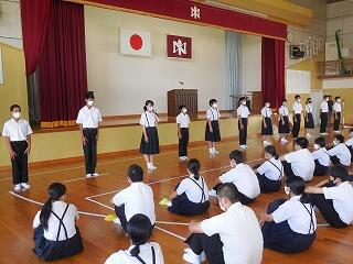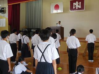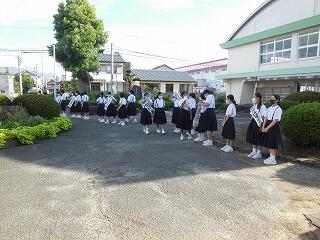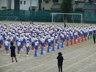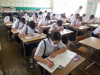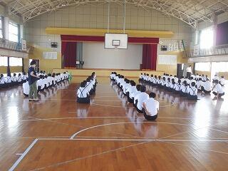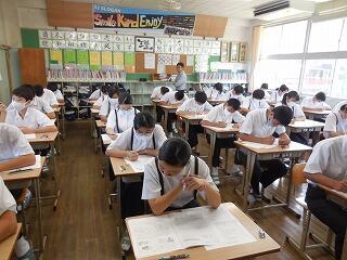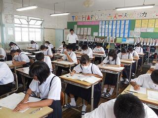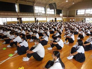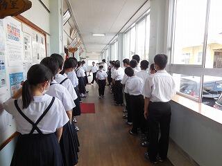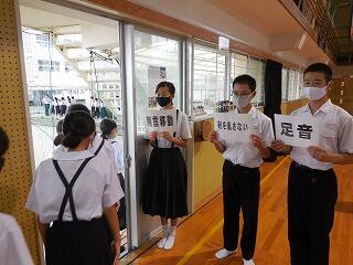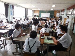 本日は5時間授業です。今日は生徒会生活委員会からの提案で、ノーチャイムデーとなっており、チャイムが終日なりません。時計を見て2分前着席、1分前黙想を行います。5時間目は全学年道徳の授業です(題材は1年生が「六十二枚の天気図」、2年生が「段ボールベットへの思い」、3年生は「根本を究めて」)。保健体育の授業では、10月9日(金)に予定されている体育的行事(今年は特別体育競技会)の準備ための体作り運動が本格化しています。
