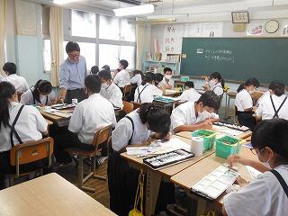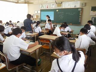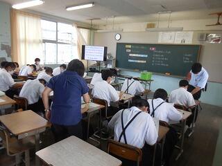 (下、5時間目2年3組の研究授業の様子、1分前黙想の様子)