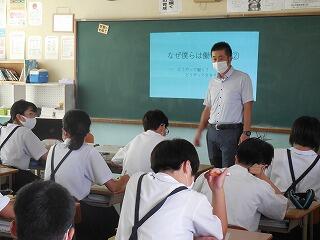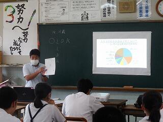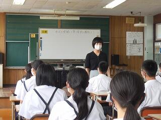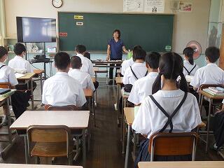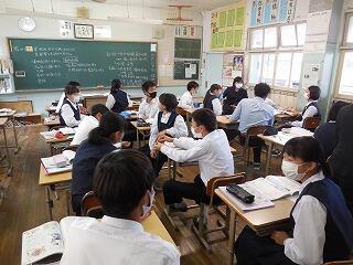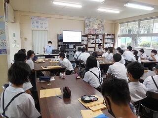 本日は6時間授業です。朝の時間に全校集会を実施しました。内容は生徒指導に関する講話で、「誰もが気持ちよく学校生活をおくるために気を付けて欲しいこと(人間関係)」、「SNSの使用等(つながり)」についてでした。生徒指導担当の先生の話を生徒は真剣に聞いていたと思います。午後の総合的な学習の時間は、全学年キャリア教育を行いました。今年度の総合的な学習の時間では、臨時休業を踏まえキャリア教育を再編成した内容で取り組んでいます。最初の8時間は全学年共通内容で行い、その後(10月22日以降)は、学年毎に内容を変更して行う計画です。コロナ禍の中、本校では様々な取組を進めています。