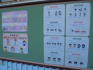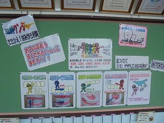 (下、保健室前の掲示物です。本校では各検診が行われていますが、現在、歯と口の健康週間です。今一度ご家庭でも話題にしてみてください。)