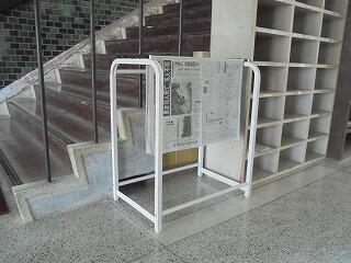 (下、玄関ロビーに新聞ストッカーを設置しました。ぜひ生徒の皆さんも活用してほしいと思います。)