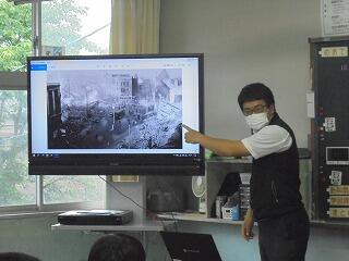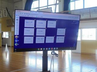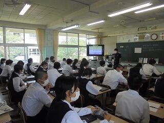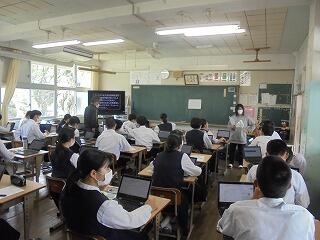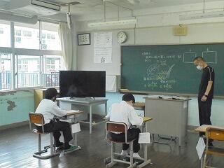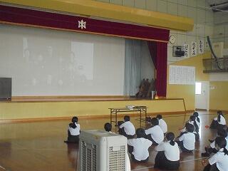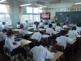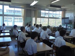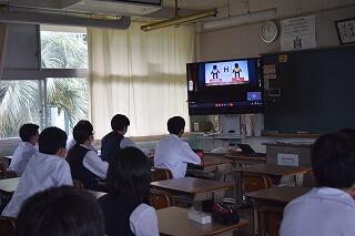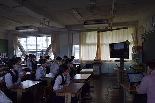 (感染症対策として、3年生はリモートで講話を聞きました。)