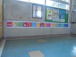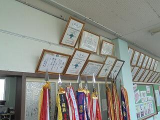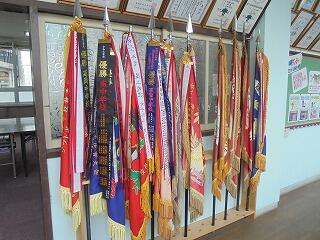 (下、中体連の優勝旗等が校長室前に飾ってあります。)