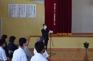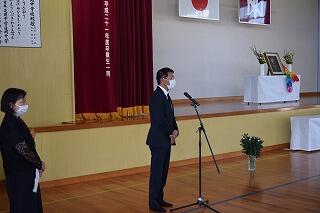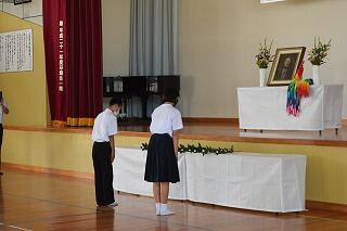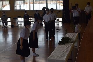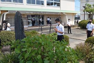 (下、延岡大空襲慰霊祭の様子です。本校で殉職された栗田先生のご遺族の皆様にご臨席いただき、感染症対策、熱中症対策を行いながら開催しました。生徒の皆さんには、平和について今一度考えていただきたいと考えています。本日は多くのメディアの取材もありましたので、ご自宅でのニュースなどを見て、話題にしていただければと思います。)