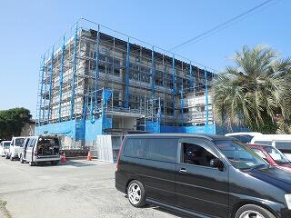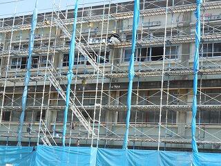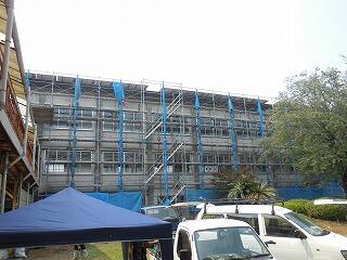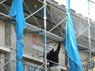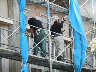 (下、第3棟外壁工事の様子、モルタルの吹きつけを行っています)