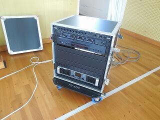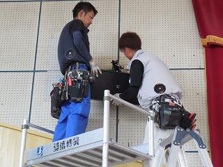 (下、体育館のスピーカー、アンプ等の設置工事の様子です)