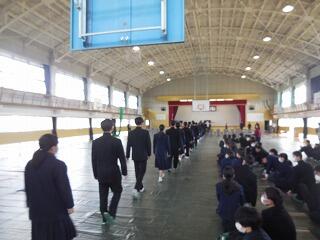 本日は火曜日ですが、月曜校時の1~3時間授業、4時間目は学級活動で、3年生は給食後下校、1・2年生は午後卒業式の準備となります。本日は校内安全点検の日です。明日の卒業証書授与式のために、今朝は臨時のクリーンウオークデーを生徒会が実施しました。通学路のゴミをたくさん拾って登校していました。地域の方から感謝の電話もありました。