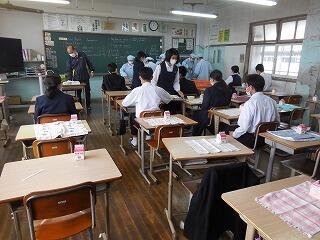 本日は火曜校時の6時間授業です。3年生は県立高校の一般入学者選抜学力検査の初日です。26名が受検します。本日受検しない3年生は、4時間で下校(給食なし)となります。