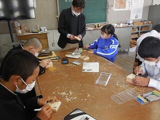 (下、本日1時間目の授業の様子、2年2組の技術、篆刻です)