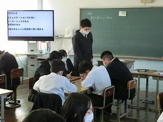 本日6時間目は1年生(学級活動)の研究授業でした。授業のねらいは、「友だちからのアドバイスによって、自分の「よさ」について気付き考える」でした。どの生徒も級友から、自分の知らなかった自分のよさを見付けてもらい、うれしそうな表情を見せていました。この経験を進路選択や職業選択にも生かして行けるといいですね。
