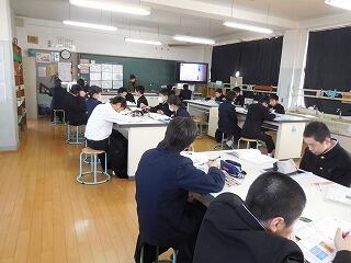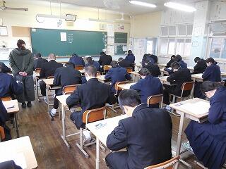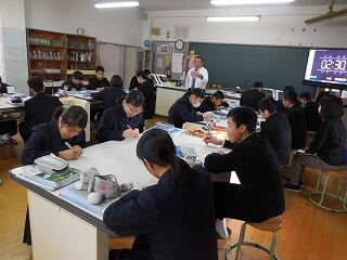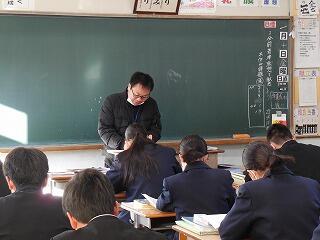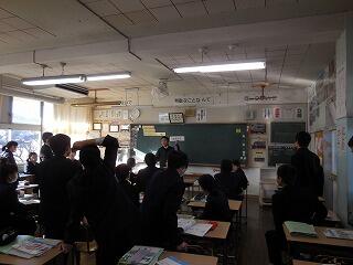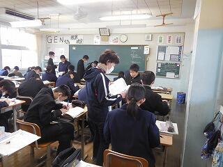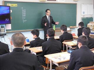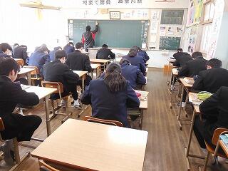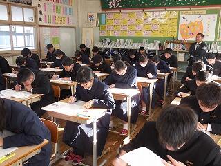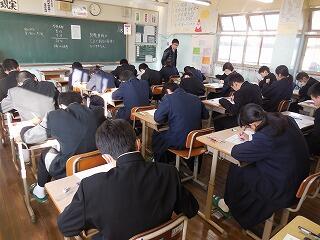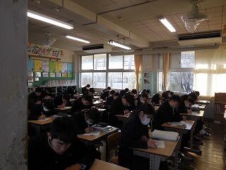 本日は午後に総合的な学習の時間があります。1年生は(高校等)調べ学習及び発表内容のまとめ、2年生は2月1日(土)に予定されている立志式の準備・リハーサル等、3年生は間近に迫った高校入試への準備学習等が行われます。また、今日はALTのチャック・シオン先生、スクールカウンセラーの染矢先生も来校されています。本日はインフルエンザの罹患者が11名となっています。無理して登校し早退する生徒が増えています。保護者の皆様には、お子さんの体調がすぐれない場合は、早めの病院受診をお願い致します。