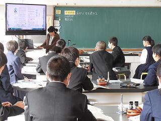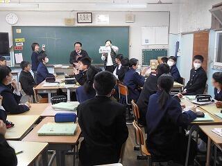 本日6時間目に、1年3組で学級活動の研究授業(初任研)を行いました。授業は1年3組の皆さんが1・2学期を振り返って、今年の目標を考えシート(大谷翔平選手が使っていたマンダラチャート)に書き込む内容でした。1年生はもうすぐ2年生になりますが、授業態度や給食時間マナー・清掃への取組など、どんどん成長しています。4月に入学してくる新入生の見本となるような2年生になってほしいと思います。本年度の研究授業も残りわずかになってきました。甲斐先生、御苦労さまでした。参観してくださった先生方、ありがとうございました。