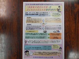 本日、下記の資料を生徒に配付しております。内容はインターネット利用に関するものです。1月20日に県内の中高生が、SNS上に不適切な画像・動画を拡散させ摘発・補導されたという報道がありました。保護者の皆様には、本日配付の資料も活用していただきながら情報モラルについて御指導をお願い致します。