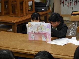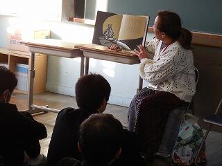 本日朝自習の時間に1年生を対象に読み聞かせがありました。1組が「上を向く少年と下を向く少年」、「ヤギとライオン」、「花さき山」、「しあわせ」、2組が素話「はな」、「いちねんせいたちとひよめ」、絵本「おまえうまそうだな」、「ずーっとずっとだいすきだいよ」、3組が「ひょうとくさま」、「もりのかくれんぼう」でした。朝のお忙しい中、読み聞かせをしていただいたゆめの宅急便・卒業生保護者の皆様、ありがとうございました。次回は12月3日(火)で2年生が対象になります。