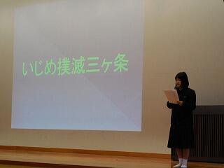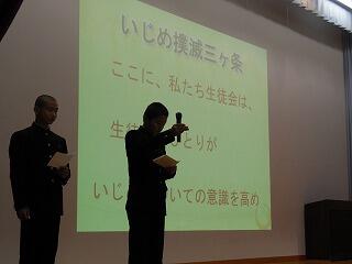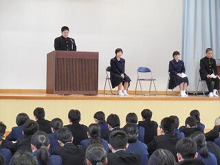 本日朝、生徒集会がありました。内容は、まず各委員会の第1期の目標と取組について、各全校専門委員長から説明がありました。その後、生徒総会で継続審議であった内容について執行部から経過報告がありました。生徒総会の継続審議の内容は、生徒会執行部でさらに検討し中央委員会に再度提案することになりました。最後に今週末に予定されているSCW(スーパークリーンウォークデー)について説明がありました。
