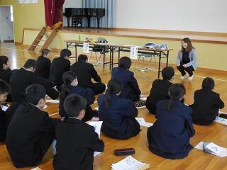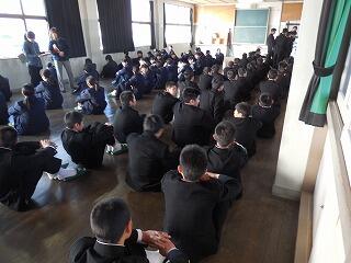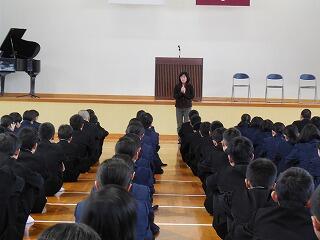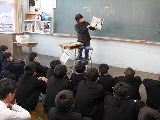 本日は、私立高校入試の初日で、宮崎第一高校、宮崎日大高校の試験が市内で実施され生徒が受験します。朝は、2年生の読み聞かせがありました。1組は素話「はな」「モチモチの木」「ぼくのおじいちやんのかお」、素話「いちねんせいたちとひめ」、2組は「なまえのないねこ」「耳の聞こえないメジャーリーガーウイリアム・ホイ」「ハクションあれツ??」、3組は「あのとききそこにきみがいた」「あかいろうそく」「生きる」を読んでいただきました。朝のお忙しい中、読み聞かせをしていただいたゆめの宅急便・卒業生保護者の皆様、ありがとうございました。次回は2月4日(火)、1年生を対象に読み聞かせが計画されています。よろしくお願いします。ところで、本日はインフルエンザによる欠席は0でした。大変嬉しい事です。他に、今日は1・2年生は6時間目に教育相談、3年生は明日実施される私立高校(ウルスラ学園、延岡学園、日章学園)入試の事前指導が行われます。3年生はいよいよ受験シーズンに入りました。最後まで諦めず、自分の力を発揮して欲しいと思います。頑張れ3年生!!