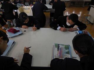 本日午後の総合的な学習の時間は、2年生が来週に迫った職場体験学習の打ち合わせのための職場訪問、1年生は先週土曜日のふるさと推進事業のまとめ、3年生は進路学習や面接練習等を行っています。2年生は事前指導の後、それぞれが自転車や徒歩で各事業所に向かいました。1年生は学年集会の後、各クラスグループ編成をして新聞づくりを行っています。