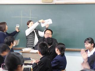 本日3時間目に、主題研究の一環として1年3組で英語の研究授業を行いました。授業は導入から展開まで大変テンポ良く進み、開始13分で本時のねらいである疑問詞Whoの意味や使い方について説明するところまでいきました。展開も大変充実しており、ペア学習や発表等では生徒が主体的に取り組んでいました。「読む、聞く、話す、書く」の4つの技能が計画的に時間配分された素晴らしい授業でした。生徒が積極的(主体的)に取り組み、双方向性(生徒相互、生徒と下野先生)があり、1年生としては大変深い学びとなっていたと思います。よく準備され50分があっという間に過ぎ大変充実した授業でした。
