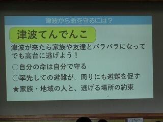 南海トラフ大地震(最大震度7、最大津波14m、津波到達時間17分)というデータをもとに、もし地震が学校で発生したら?学校外で発生したら?等、様々な事を考えさせられるお話でした。