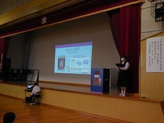 (下、朝の生徒集会の様子、中央委員会の取り組みの説明と生徒会の栞コンクールの表彰がありました)