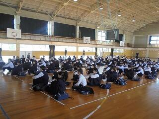 本日は水曜校時の5時間授業です。今日は生徒会の呼びかけで地域のゴミを拾って登校するクリーンウオークデーです。15時以降に生徒の皆さんは下校となります。2時間目に1年生数学の研究授業を行います。15時55分から方財小学校において、新年度入学予定の児童・保護者の皆様を対象に制服等の説明を行います。