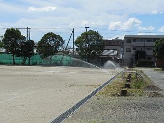 台風19号の影響で昨夜から強い風が延岡市一帯に吹いています。そのため朝からスプリンクラーを稼働させていますが、学校周辺の皆様には大変ご迷惑をおかけしています。強風が治まるまで、散水を継続して参りますので、御理解を申しあげます。