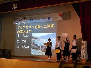 本日午前9時から令和元年度延岡中学校文化発表会が開催されています。午前中は英語暗唱・弁論、2年生の発表、1年生の発表、合唱コンクールが行われました。どの発表もこれまでの準備の成果を遺憾なく発揮し素晴らしい発表となっています。午後は吹奏楽部の演奏、3年生の発表、閉会式が行われます。また閉会式後に新生徒会役員の任命式が行われる予定です。