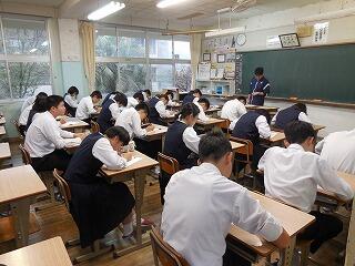 本日朝自習の時間に、県英単語コンテストに向けて力を付けるねらいで、第2回全校学力クラスマッチ(英単語テスト)を行いました。このテストは、生徒会学習委員会が企画したもので、問題作成も学習委員会が行いました。また、朝の会や帰りの会で「ミニ単語10問テスト」などを行いこのテストに備えてきました。採点も学習委員会が行いクラス平均を出して、生徒集会時に上位3クラスを表彰することになっています。本校生徒の学力向上の機運が高まり、生徒の皆さんが学びに向かっていくことを期待します。