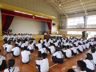 本日午前中、延岡保護司会の中島克洋様が来校されました。中島様からは保護司の活動や延岡市の状況等について説明をしていただきました。また、中島様は本校卒業生で校章の由来や本校の歴史についても教えていただきました。本校の校章は、初代校長の下田敏校長先生が考案されたこと、Nの文字、ペン、ノートの形をイメージして作成されていることなどを教えていただきました。ご訪問ありがとうございました。