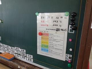 本日正午時点で、気温34.2度、湿度74.2%、WBGT値32.2(31以上は運動禁止)でした。そのため給食時間に注意喚起の放送を養護教諭が行いました。まだまだ暑い日が続きます。また、市内でインフルエンザ流行の兆しもあるそうです。健康管理及び体調管理には、十分気を付けてほしいと思います。※本日の部活動は、安全確保のため待機またはミーティング等に切り替えています。