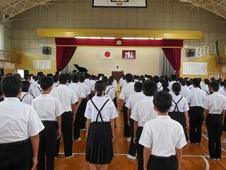 本日、2学期の始業式を行いました。式の前に転入職員3名の紹介を行いました。その後、夏休み後半に実施された大会等の表彰を行いました。始業式では4名の生徒の皆さんが、2学期にかける思いをそれぞれ述べました。式終了後は、生徒指導面で3つの注意を酒井先生から、2学期の学習面、保健面、の注意を廣木先生からしていただきました。その後、各学年で集会がありました。