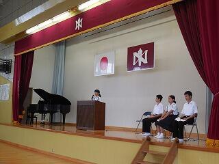 終業式では4名の生徒の皆さんが、それぞれ学期反省と2学期に向けての抱負を述べてくれました。生徒の皆さんは、言葉遣いや学習生活面での振り返りを行い、2学期以降頑張りたいという発言が多くありました。この短い学期の間にも確実に成長している姿がありました。大変嬉しい事です。