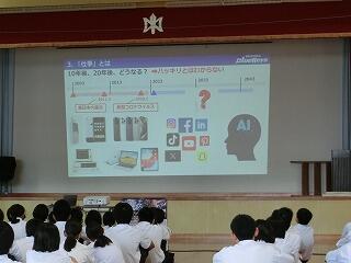 また、講師の方のニュージーランド留学などの様々な経験から、現在の仕事に就くまでの過程を話していただき、仕事選びをするために「さまざまなことに興味をもつこと」「何にでもおもいきって挑戦すること」などが大切であるという話をされました。生徒自身も将来のことについて考える大変よい機会になりました。