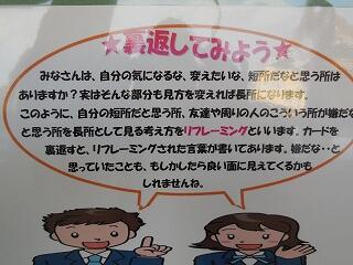(下、保健室の掲示物(脇坂先生作成)、2月の掲示物ではリフレーミングについて説明しています。リフレーミングとは、物事は視点を変えることで、意味がかわる。短所も見方を変えれば長所になるということです。カードをめくってみてください)