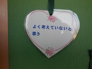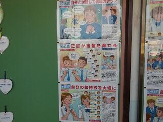 (下、3棟3階1年生の掲示、BFC特選作品、橋野さんの標語です)