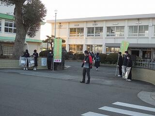 (下、生徒会の皆さんが校門前でゴミを集めています)