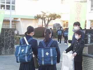 本日は水曜校時で5時間授業です。宮崎県立高等水産研究所の入試が日向市で実施されます(3年生が一名受験します)。5時間目に、明日実施される県立高校推薦入試の事前指導を行います。本日も部活動停止です。本日はクリーンウオークデーです。生徒会の呼びかけで、朝の登校時に通学路のゴミを拾う活動を行いました。