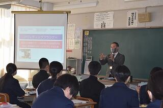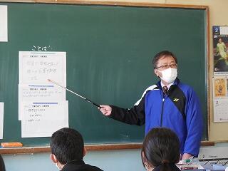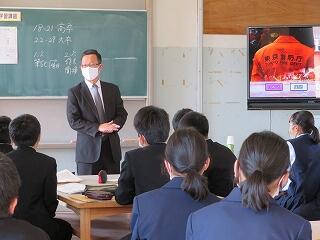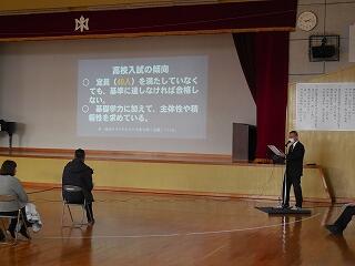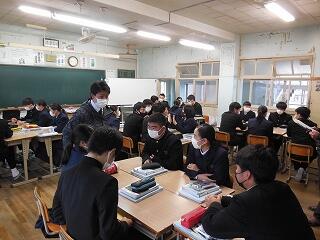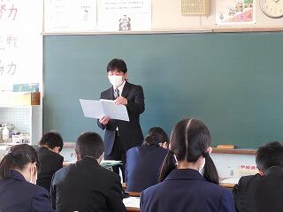 (下、6時間目は3年生の私立入試事前指導が行われました。明日から様々な学校の入試が始まります。先生方から諸注意が行われました、下は宮脇学年主任の話です)