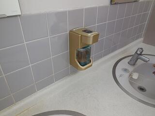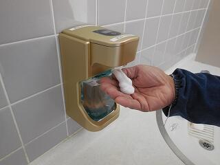 (下、校内の手洗い場にソープディスペンサーを設置しました。手をかざすだけで石けんが泡となって出てきます)