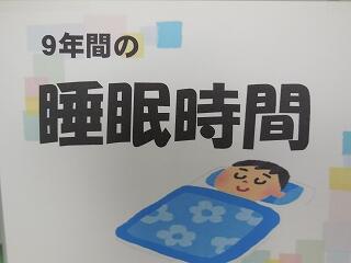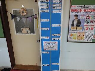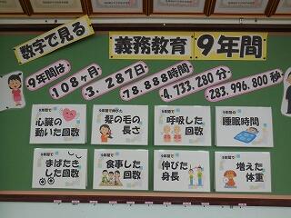 (下、保健室前の掲示版、3月のテーマは義務教育9年間です。是非、カードをめくりに来てください)