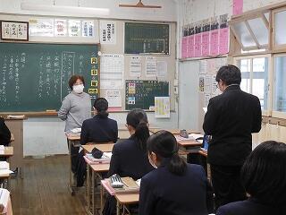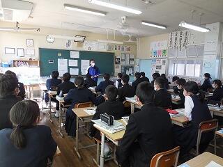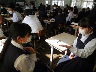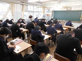 本日は木曜校時の6時間授業です。2・3年生は5・6時間目、1年生は6時間目に総合的な学習の時間があります。また、1時間目は数学の研究授業(1年3・5組)です。来週はいよいよ私立高校の入試(1月27日がウルスラ学園、延岡学園、鵬翔、日大の各高校、28日が日章学園高校)です。そして、2月4日は県立高校の推薦入試が行われます。落ち着いた学校生活と感染症対策に全校生徒・職員で取り組んでいきます。