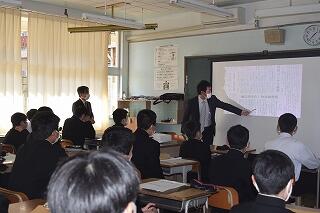(下、4時間目の2年1組社会の研究授業の様子です)