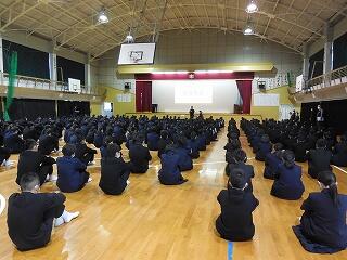 今日は月曜校時の6時間授業です。明日から後期学年末テストが始まります。そのため部活動は停止です。また、校内安全点検の日です。本日全校生徒の皆さんにユニクロ製のマスクを1人一袋(3個入)を配付いたしますのでご活用ください。