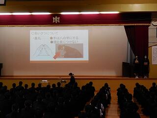 (下、朝の生徒集会の様子です、語先後礼、立礼、座礼等の説明がありました)