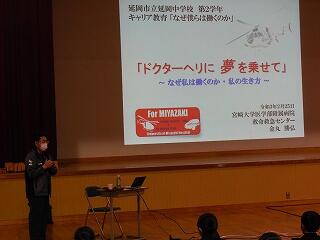(下、午後は宮崎大学医学部付属病院救命救急センターの金丸勝弘先生の講話でした。題は「ドクターヘリに夢をのせて」です)