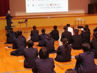 本日は木曜校時の6時間授業です。2年生の総合的な学習の時間に、宮崎大学救命救急センターの金丸勝弘先生の講演会(キャリア教育)が実施されます。朝自習の時間は生徒集会が行われます。内容は挨拶の確認と送別遠足についてです。