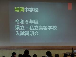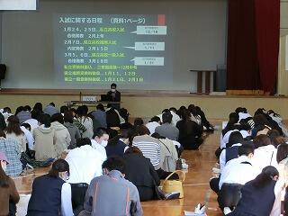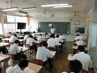 県立・私立高校説明会を実施しました。内容は、入試関係の事務手続き・自己推薦書について等です。生徒たちも自分ごととして真剣に聞いていました。3年生98名全員が、希望する進路実現を目指して生徒・保護者・学校で力を合わせていきましょう。